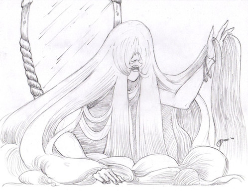 MOAR FAIRYTALES!!! The witch cutting off rapunzel's haiiirr!I like this one least of the ones I've done so far; probably because my pens were on their last legs and I had to go over some of the lines over and over before they were dark enough and it was VERY FRUSTRATING....