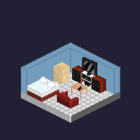 Interesting Earthbound-ish angle you have here. The part I liked the least was the angle you used for the desk at the right of the scene. If I'm not guessing wrong, it's a 45 degree angle, and those ones don't work too well with this kind of pixelations. I'm afraid that the only way to solve that is, getting rid of it, and re-pixel that desk and computer in the same angle as everything else in that picture. It looks too "out of the place" if you leave it like that.