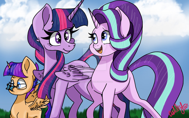 Something in Hitch reminds Twi of her first love. Could it be the mane style? Or because they were both orange? XDDThis is my entry for MLP:FIM's thirteenth anniversary event on Derpibooru. I could have done it better but I'm going through some stuff so I hope this is okay.