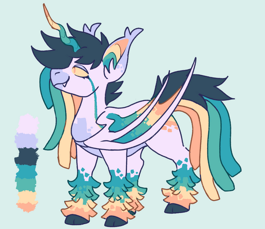 I wanted to update Techie's design and finally make an official ref sheet, so here it is~As most of y'all know, Techie is a trans draconequus/unicorn hybrid! He's a mix of plenty of animals, like a sheep, pony, lion, goat, chicken, and lake sturgeon (which looks fairly similar to a shark tail).