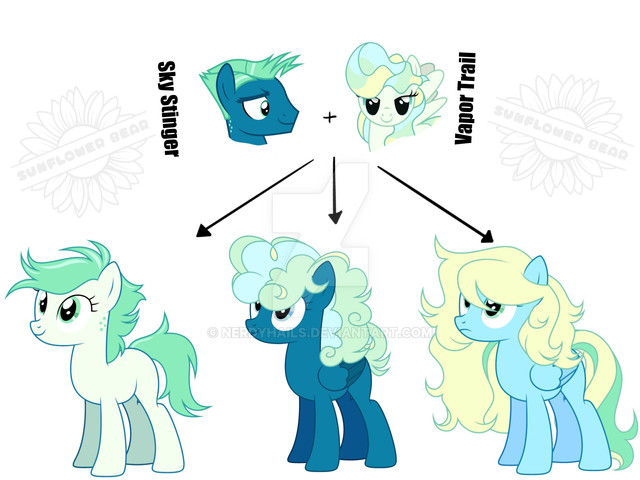 Why do these ponies have to have such crazy hairIt wasn't much of a surprise to others that Sky Stinger and Vapor Trail clung to each other after they met as foals. Vapor Trail got to escape from her smothering parents, and Sky Stinger finally had someone to give him constant attention and praise. And if spending time with Sky meant Vapor occasionally gave him a wind boost when they were flying, so what? She didn't see the harm in it, until his confidence turned into aggressive cockiness and almost destroyed his chances of achieving his dream of being a Wonderbolt. Fortuntately, with Twilight and Rainbow Dash's help, both Sky and Vapor were able to improve themselves and ace their auditions into the cadet program, where they both became Lead Ponies during training.