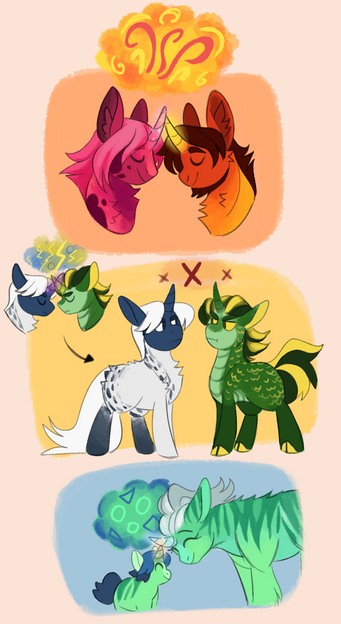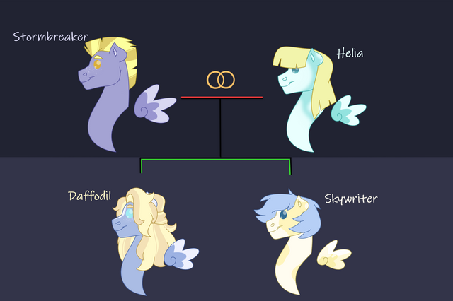 It was Vapor's idea that the two not get married until they had officially become Wonderbolts, especially since it was clear they both wanted to work hard and focus on their careers. Fortuntately, they became full-fledged Wonderbolts just under two years later, allowing Dash to mention that they could finally tie the knot and invite everyone at headquarters to the wedding. It took another year to plan the wedding, but they did indeed invite every Wonderbolt, along with their families, to celebrate their special day. Vapor and Sky wanted to have a child immediately after getting married, joking that they could be a family of Wonderbolts when their kid got old enough. Unfortuntely, Vapor Trail suffered multiple miscarriages and the couple doubted that they'd be able to have a foal of their own. It took a toll on Vapor, who struggled with the idea of not being able to be a mother. But when they least expected it, Vapor became pregnant again, this time with a child she was able to carry to term. Jade Lightning was their little miracle and knowing the chances of them having another was impossible (due to a necessary procedure during Jade's birth), the couple catered to their colt in every way, while doing their best to allow him to be independent.