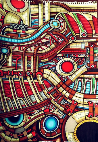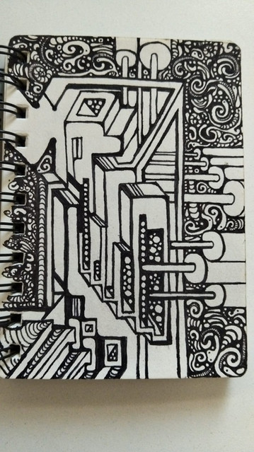 I like the way the white spaces contrast with the areas of activity. I also like the collage-like feel of the different panels. You could create more value contrast from panel to panel using transparent ink washes along with your pen. You could even start tinting the panels with color, if you want to do that.