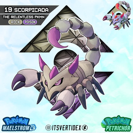 Meet Mortedra, the stinger pokemon of the Suldana Region!Mortedra's most distinctive feature is its segmented tail, which is adorned with sharp, jagged rocks. The tail serves a dual purpose - not only as a formidable weapon in battles but also as a reservoir for its toxic venom. The toxins produced by Mortedra's venom are highly corrosive, making it a dangerous adversary for both trainers and other Pokémon.