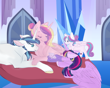 Some of the guilt came back then - Celestia was not Twilight's real mother. Her eyes hardened momentarily, and she considered drawing away, but Twilight had grabbed onto her face and giggled merrily. Celestia raised one arm and pressed a finger against Twilight's nose lightly. She was lonely, in the way only immortals and rulers can be. Her status had never allowed her a family. And she did so crave a family. Well, alright. She would allow herself one now. A queen, a goddess, and a magic child. It was strange, but it was hers.
