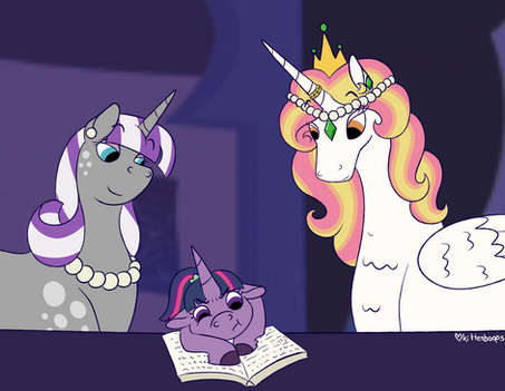 Celestia's guilt kept her away from Twilight, at first. Taking a baby from her mother was terrible. But this was the path she had chosen to protect Equestria. This was the hand she was dealt. And making Pinkie care for the filly all by herself wasn't fair. And she HAD made sure the Sparkle family was well taken care of, well compensated for their sacrifice. So, after much deliberation and pacing around her room, the immortal ventured into Twilight Sparkle's nursery.And fell in love. Not even bothering to take off her jewelry, the royal monarch sat on the floor and began to play with the unicorn baby, who babbled at her with bright eyes. The filly tugged at her earrings, curiously, and could already toddle - "So clever!" Celestia crooned. "A regular little student already!"