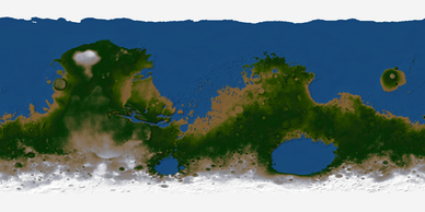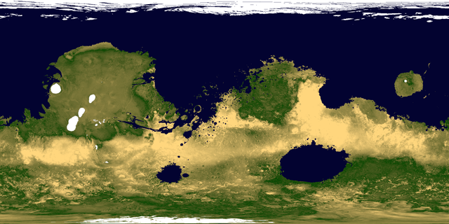 Most people when they think about terraforming Mars think of Earth's atmosphere, but assuming 1 bar surface pressure (which I do for this map) Mars' atmosphere would be much deeper due to the lower gravity and more gas needed to get the 1 bar pressure.
