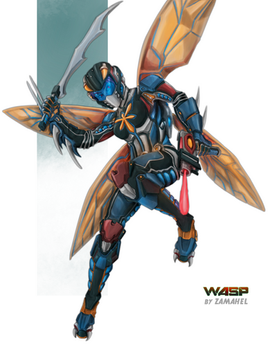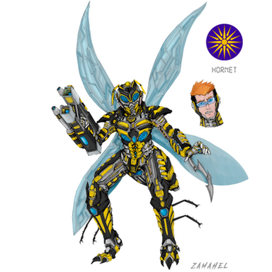 The HORNET is an original character who plays a role in my original story, the IN LAK'ECH Mythos. Details (and SPOILERS) of the story follow:The Hornet is the seventh member of the Insect Syndicate, a semi-official military group funded by the secret Saqraruna Organization with international actions but based in Chinchaysuyu (equivalent to the Northern Peruvian Coast), part of the State of Tahuantinsuyu (named after the Inca Empire) that wear customized versions from some of the super-powered symbiotic ALPHA-OMEGA armors salvaged by them from its original owner, the AXIS Institute, and its eventual new owners, throughout the story's progress.