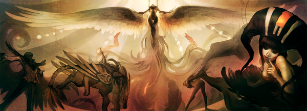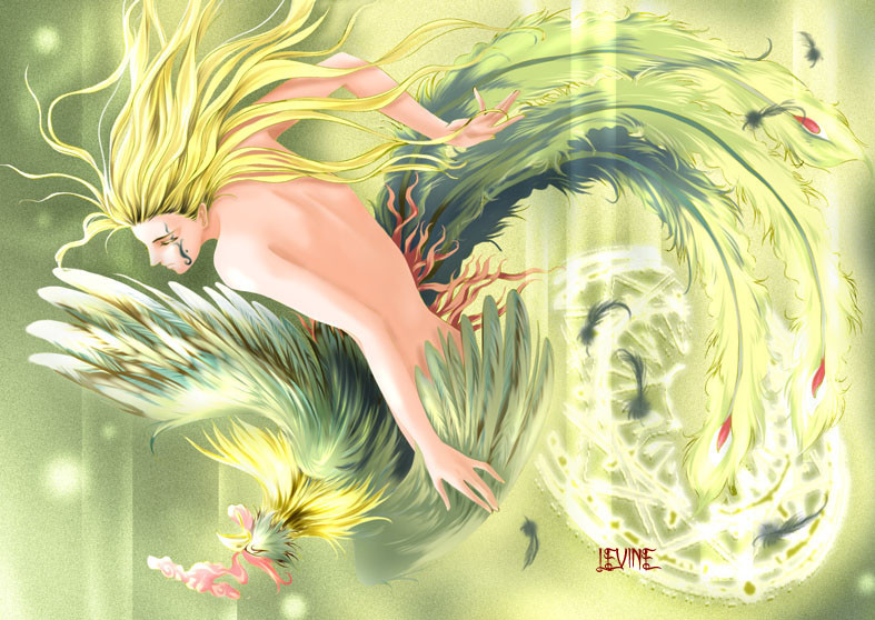 This is beautiful. I love how she seems to fade from the pheonix. Love the colors, the almost invisible mountains, and the whispy detail. Great job!