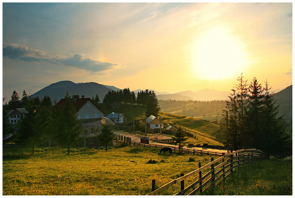 Compozitia si cromatica fotografiei sunt superbe.. lafel si lumina. Doua lucruri sunt deranjante cand o privesti... acoperisurile caselor din stanga... si copacul care este aproximativ in centrul cadrului.. Imi plac copacii dar asta iese prea mult in evidenta... e prea central si contrasteaza prea mult cu fundalul.. in momentul in care te uiti la fotografie instant iti fug ochii pe coroana copacului si din cauza asta ratezi detalii precum umbrele "aruncate" pe dealul din dreapta pe care ai vrut sa le accentuezi..
