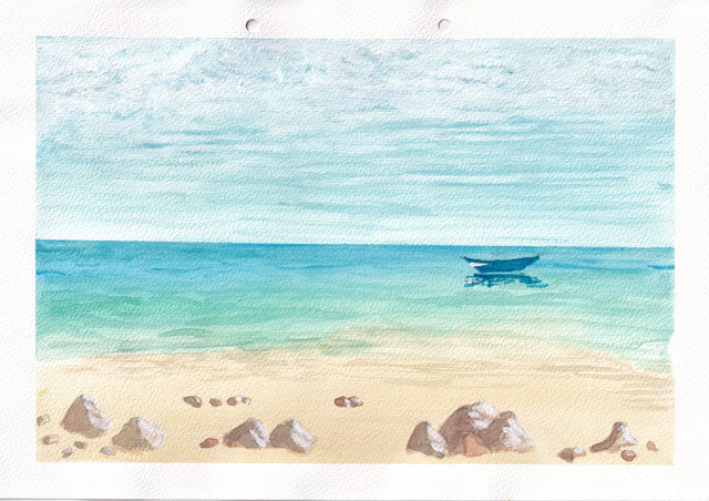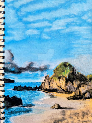 A tiny advice for improvement: the line from your sketch (which I assume you did prior to colouring) that is still visible along the shoreline where water and sand meet, seems to make the transition from one element to the other a bit sharp. Maybe next time, try to make this line as faint as possible in your pre-drawing, or smooth it out with your pastels. Maybe I'm just nitpicking, but I think that may be improved upon.
