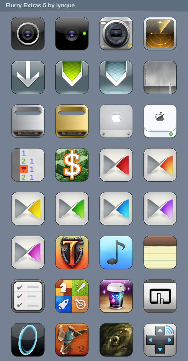 Designed to work with other Flurry & Phoney iPhone-style icons. Some are just the original/iOS icon reformatted for Flurry/Desktops. From left-to-right, top-to-bottom:-iPhone Camera*