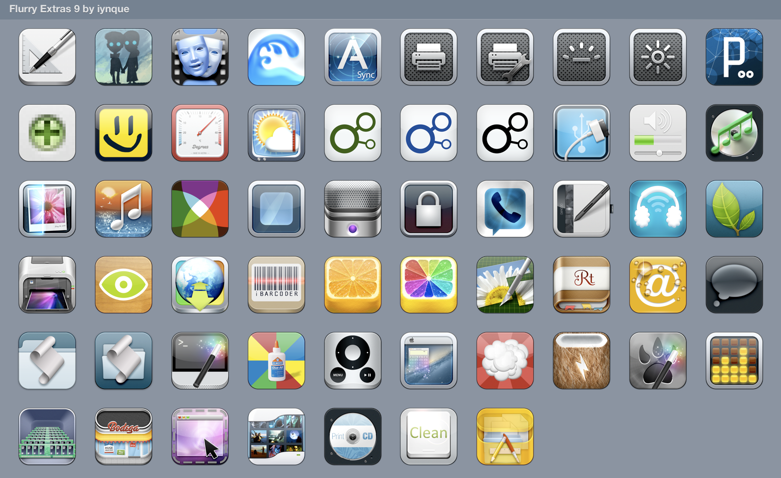 Designed to work with other Flurry & Phoney iPhone-style icons. Some are just the original/iOS icon reformatted for Flurry/Desktops. From left-to-right, top-to-bottom:-Delineato
