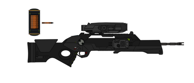 The new MPP (Magnetically Propelled Projectile) is a collaboration of human and Sangheili tech. With a 10 round magazine that will hold a multitude of ammunition types, it's a favoured piece of Iyst's gear. From HEIAPs (High Explosive Incendiary Armour Piercing) to standard ball points to saboted penetrator rounds.