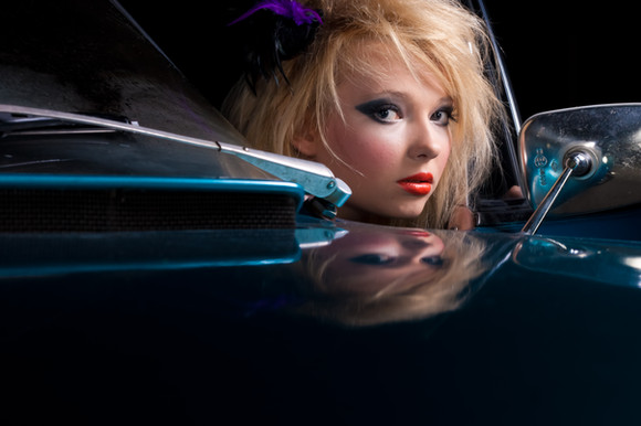 Her makeup looks great. Perfect look for a girl riding around in a vintage car!