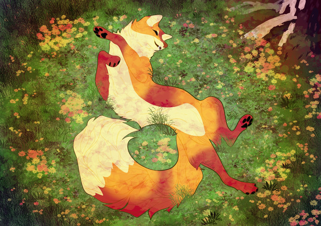 A very sincere happy birthday to V, an awesome artist an wonderful friend. I wanted to draw her beautiful fox just relaxing in a spring grassy field.(This was submitted a lot earlier during her actual birthday but forgot to do it on dA)