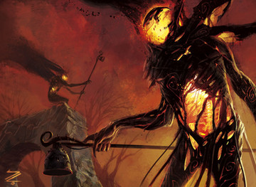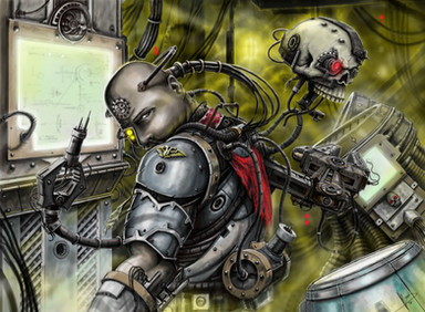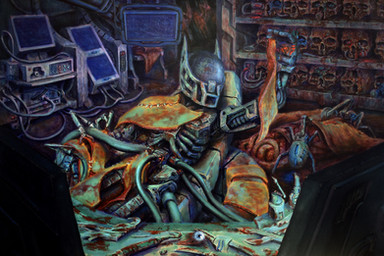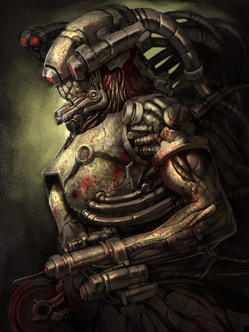 I'm not familiar enough with card games to figure out what this is, nevertheless I love the shiny plastic (porcelain?) look of their body and the blood-meat internal stuff. The black eyesockets and mouthless skull faceplate are also really cool, the being depicted is creepy as hell and the elongated head makes me think of xenomorphs, which pulls even more biomechanical and horror into it! The lens attached directly to their head via posts instead of on a string or strap or goggles is pretty cool too, love the way the light reflected from behind them into the cloth makes the lens red! The ribcage torso is a nice touch and goes well with the head, and the pinkie held up in the scalpel hand is kinda cool too, instead of all one fist, more of a 'delicate touch' look almost. The critter in the background is a pretty cool one too, although it's looking more like a suit of armor and less like an animate horror. The lack of glow and straight posture makes me think of suits or something on a wall, waiting for someone to put them on or displayed to show craftsmanship. And the hand in the foreground is nicely jointed, I like how you separated the kuckle and first bone shape with color, and the little subdivisions in them. Back to the surgeon, the way his faceplate is designed he seems expressionless yet... Pleased? His posture and the gleam of his eyes makes me think he's pretty focused on the task at hand.