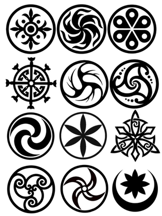 Yet more Realm-of-Serpents artwork. These are designs for the crests of sundrake nobility - rather than having coats of arms in the shapes of shields, their emblems tend to be circular with elements of symmetry. Not all of these have been assigned an associated noble house in-lore, but the top right and very bottom ones are for house Starstrike and house Halcyon respectively.Other Links:
