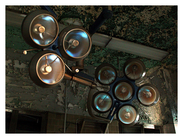 Another awesome photo! I wish there were such old things where I am. I like how the chair is standing all alone in the middle of the room (although not the middle of the photo). The debris and peeling wall gives you a sense of how old the place really is. Oh yea, the operating light really is cool. I'd have one of those in my bedroom.