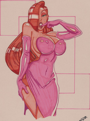 One of several custom drawings I did for my "TALL" sketchbook, earlier this year. This one of Jessica Rabbit! Large sized Canson art paper (19 x 24 I believe, cut in half). Faber-Castell PITT artist Pens (Mostly S, XS and the fat B!) for the blacks & line-work, Sharpie Poster-Paint Extra Fine Point for the opaque highlights.Original Art available HERE!: