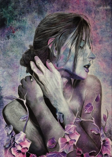 I'm not trying to make my works too realistic, so I love to mix it with some kind of decorative elements. The plants are her clothes and the silver cocoon at the same time.)