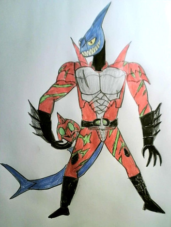 Kamen Rider Jaws gets his powers from a relic which was forged in the Pacific islands. The relic is said to be made by the shark god out of palm bark, leaves, coconut husks, and lava rocks. When worn, it will give the power of the shark to whoever wears it.