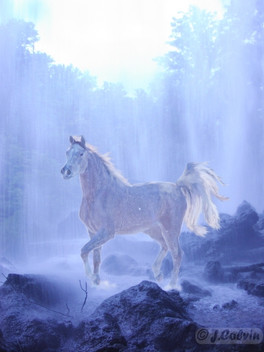 We creep as quietly as we can though the undergrowth and peer through the trees. I heard the trickle of the stream first with splashes and soft nickers and whinnies. Creeping up to a clearing the moonlight filters down onto the herd of unicorns glowing brightly in the dim light. The foals were splashing and playing around in the water while their mothers grazed peacefully nearby.