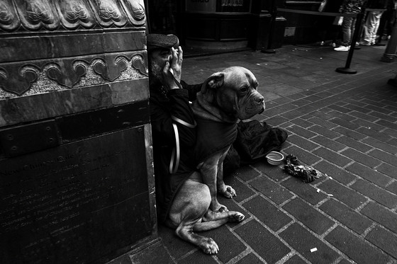 I am not a big fan of beggar images. Not only it is a very common subject for street photography, but more annoying is the fact that you will always find tons of people to claim to be moved by a such image, while they will go their way and overlook the beggar while in the street. Another typical weakness of beggar's images is that there is not interaction what's so ever with the place or the people around. In that regard, this image is much better: Not only there is this symmetry - the dog on one side, the man on the other - framing the door, that tells me that this guy wants to catch everybody who is going to use this door - the dog will force the walker by to use the right door, where is will be caught by the man - but you also show the interaction with the crowd - in his gaze and by having cleverly including people in the reflection.