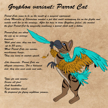They are based on the criosphinx statues found in Egypt, Thebes. They were believed to be representing the god Amun; he was portrayed wearing headdress with two plumes, which is why they come from painted or dyed feathers. That they are statues is also the reason for their size differences as well as them being guardians.