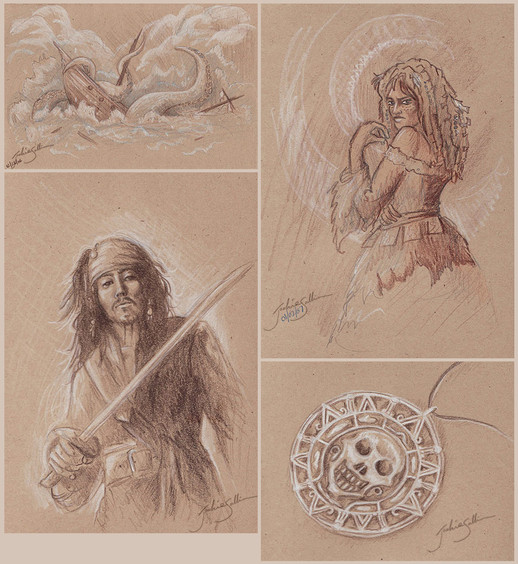 In the summer of 2006 I was teaching art classes for kids at the Old Sculpin Gallery on Martha's Vineyard. One day I decided we should have a pirate day, so I had the kids design their own treasure maps and then showed them how to age the paper. Basically, we crinkled the paper, ripped it up, dropped some ink blotches on it, dunked it in water, and then rubbed inexpensive coffee grounds into the paper. It worked really well.This was the demonstration one that I made up in advance so that I would have a map all designed and ready when it came time to show the kids how to age the paper. The kids helped me name a bunch of places on the map - influences came from (obviously) Pirates of the Caribbean, Peter Pan, The Princess Bride, The Wizard of Oz, and things around Martha's Vineyard. It was one of the most popular projects we did all summer.