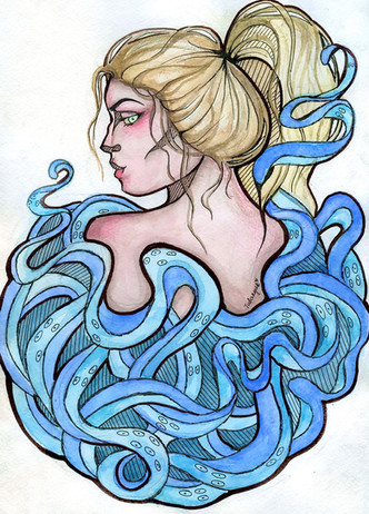 She feels him stir, his mighty form begin to twist and writhe. “There there” she soothes. She begins to call the currents of the depths around her. Commanding the tides as she has done so often before. “We will wait my love, wait until our prey draws near”. She watches above, seeking the shadow that glides along the surface. The shadow that brings their meal. “Wait now” she croons “the tides and swells I have called will bring them” her voice soft. She smiles “you will use your strong arms to bring them down, down, down”.
