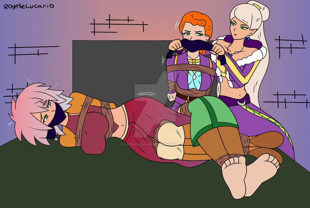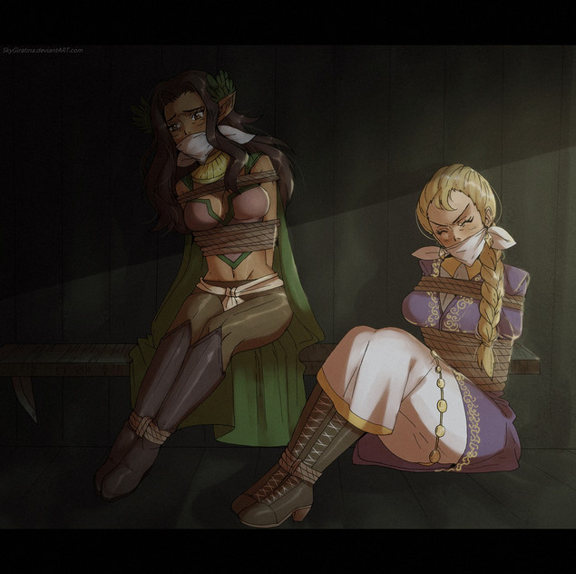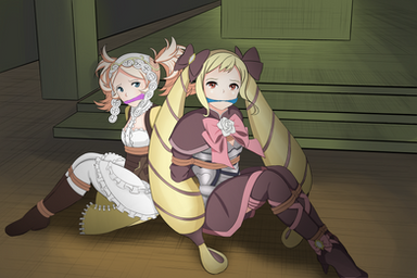 Cvet had been looking forward to getting to spend some time with her dear (if rather *odd*) friend Lilja Trevaine at the Beistad Gala. Little did Cvet suspect how much time that would be. Scarcely had the dolled up princess arrived at the posh yet private event, that shadowy figures descended upon her and dragged her kicking and mewing into the Galas basement, where they already held a terrified Lilja hostage!The fiends wasted no time in having the two girls trussed up and gagged, but they were too thorough to stop there. The two gals were stacked on-top of eachother, and rather meticulously rolled up into a carpet! Cvet, no stranger to distress or a little bit of skin ship, ignored the undignified situation squirmed in spunky defiance as their captors locked the two away in a side room. But Cvet was unprepared when she noticed the serene calm that had overcome her fellow captive, whose bosom was docked with hers. Lilja ignored all of Cvet's muffled inquiries or suggestions on how to escape, and pressed her face to Cvet's in a way that seemed disinterested in rubbing their snug cloth gags off.