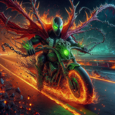 Hell Ruder Created By: JADDED. A fan based piece of Spawn and Ghost Rider fused together into one on a flaming Harley-Davidson.Related content