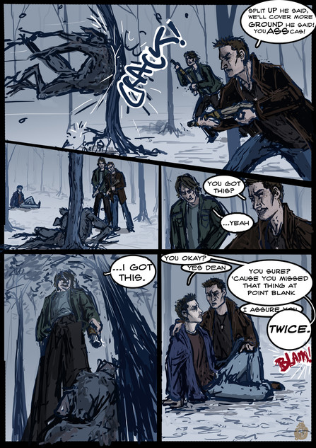 Sam sits at the kitchen table, and jumps when a mug is placed in front of him. He looks up at Cas who smiles before heading back to the pot, collecting a third mug from a box on the counter.