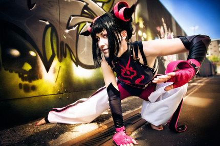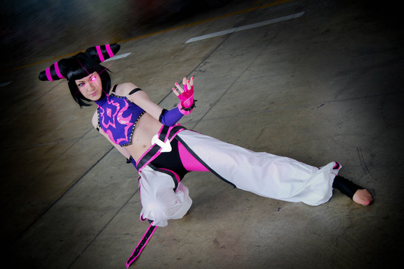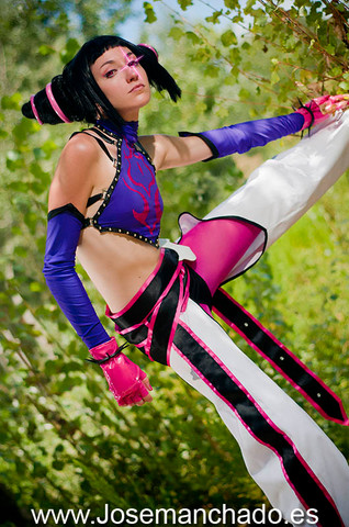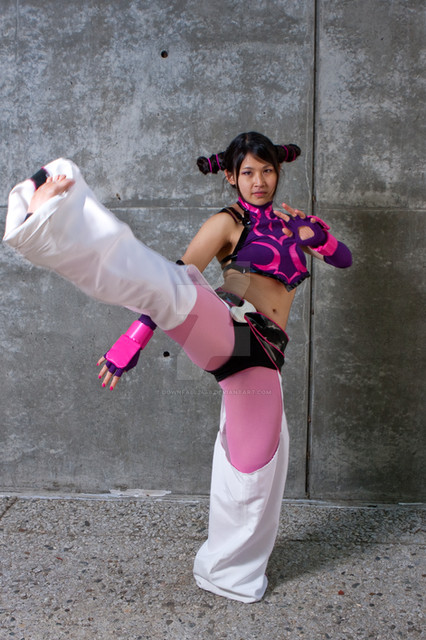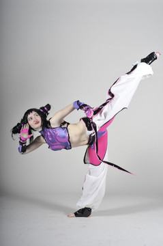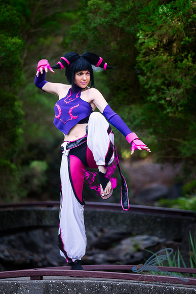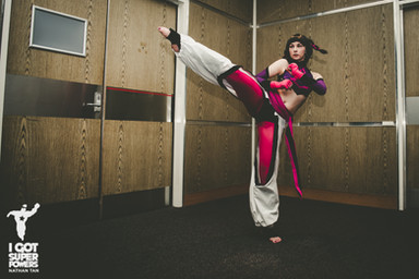 I had a lot of fun trying to get this picture right. I haven't been training very long and technically haven't been taught how to do a jumping side kick yet, but judging from the reaction I got from the photographer I guess I did alright aha..Juri cosplay made and worn by me