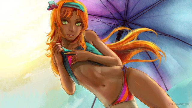 This is sooo beautiful! I really like how her hair is more red with the blue umbrella in the background. Amazing artwork!