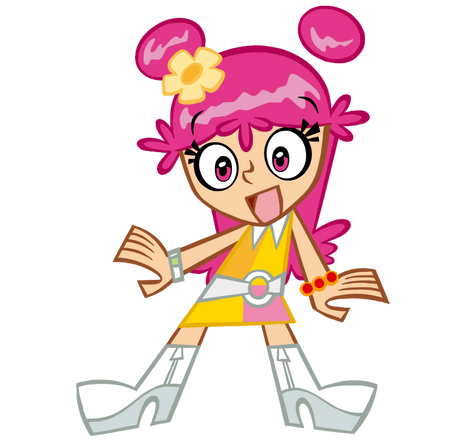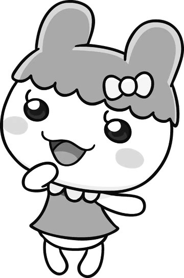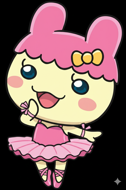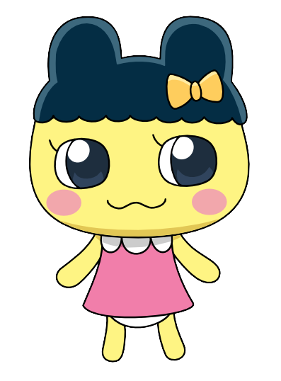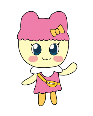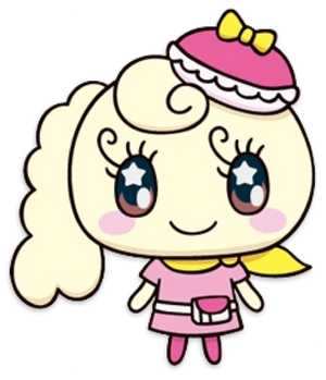 Chamametchi has pale cream skin, navy blue eyes with curled eyelashes, pink cheeks, and a curvy mouth like a cat's. She wears a pink mame cap with a yellow bow, white bottoms, and a pink shirt similar to a petticoat .Stage