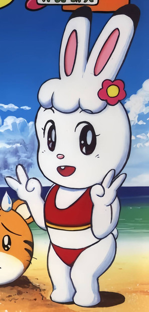 She is a white 5-year-old child bunny/rabbit/hare with 3 black whiskers on each side of her cheeks, a dark brown nose, white/light blue eyes, a fluffy white tail, light pink inside ears, two eyelashes above each eye, white ears, a dry mouth, and often wears a pink dress with a blue rounded collar and red button, light yellow stockings/socks/tongues, and sand green flats/shoes. She also has a brown patch of curly hair on her head.