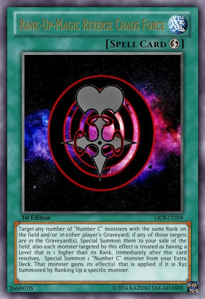While looking up some of the fan made Yu-Gi-Oh cards on this site, I found that some of the members here on DA were turning Cardfight!! Vanguard cards into Yu-Gi-Oh! cards. So, I thought I might try it out. I tried to make the effects each card similar to the abilities of their Vanguard counterparts. Plus I also changed the names a bit on a few of the cards. I hope everyone enjoys this.Now Presenting Rank-Up-Magic The Reverse. This spell card helps bring out all the "RXyz" monsters that I perviously posted on DA. For the artwork on this card, I took a picture of the lock symbol that appears in the anime. From there, I added some smudged black and with some red glow on photoshop to give it the evil energy that surrounds those who have been Reversed. I hope I did a good job. Please enjoy.
