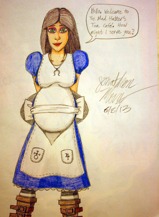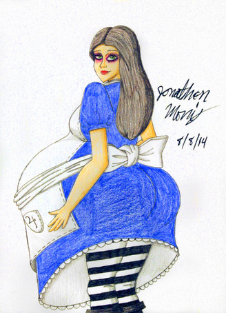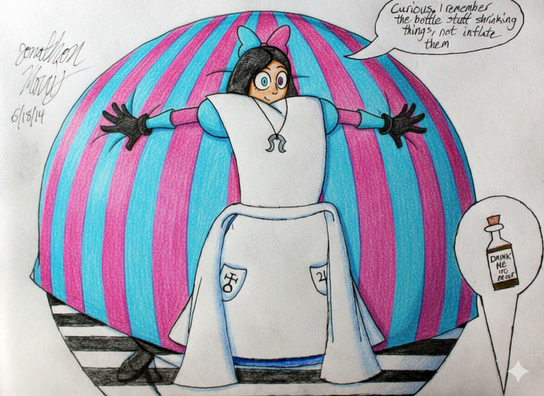 Presenting another Art Request. Today's request was made by , who wanted an inflation drawing of Alice from American Mcgee's Alice video games. I thought is would be interesting if this inflation was caused by one of the "Drink Me" stuff that's in wonderland. And the 180 Proof that is one the bottle is a nod to Nostalgia Critic's review of Tim Burton's Alice in Wonderland. Please enjoy.(Alice belongs to American Mcgee's Alice.)