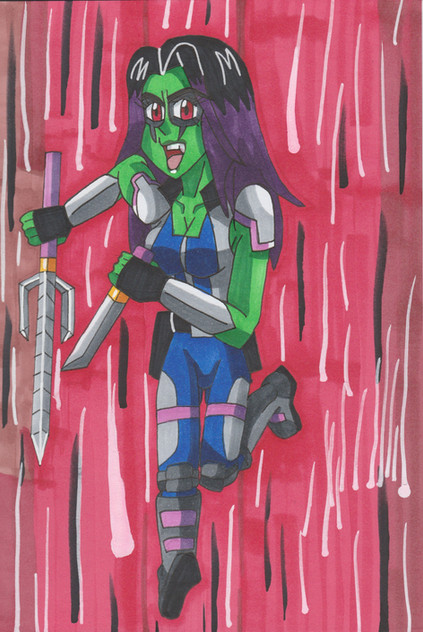 Gamora was the sole survivor of the alien humanoid race called the Zen Whoberis, a peace-loving people whose population were wiped out by a zealous religious order seeking to establish a galaxy-wide empire. Agents of the Church, called Grand Inquisitors, herded the entire population of the planet into a valley and exterminated them all for their resistance. The mad Titan Thanos rescued Gamora and brought her through time to a period at least two decades prior to her people's deaths, travelling from Earth-7528 to Earth-616. Aboard his space station Sanctuary, Thanos raised Gamora and used advanced technology to endow her with enhanced humanoid abilities. He also subtly altered her perceptions so that she would not recognize the evil of her deeds.Thanos decided to train her as a weapon to use against and kill the Magus. Thanos made sure Gamora was raised with discipline, though he did on occasion show her affection as a father would show his child: such as celebrating the religious holiday of Yule. Through rigorous training she would become a highly skilled master of various martial arts forms from throughout the universe. Even though Gamora was learning and becoming a master martial artist, she still had more to learn. While still a young girl, she went on a trip with Thanos. Though explicitly against Thanos orders and warning, out of curiosity she decided to venture planet side. In turn she fell into an ambush set up by a group of thugs. The attackers used their numbers advantage and were able to defeat her in spite of her great skill. She was severely injured in the fight and gang raped. Near death, her proverbial knight in shining armor arrived in the form of Thanos, who quickly dispatched the assailants. Thanos then recovered the apologetic and near dead Gamora. After returning to Sanctuary, Thanos restored and augmented Gamora. This was achieved via bionic implants and replacement parts of Thanos' own design. These physical and power upgrades made her an equal to Adam Warlock's own physical abilities. She also received specialized training and abilities including resistance to reality distortion as well as an accelerated healing factor.