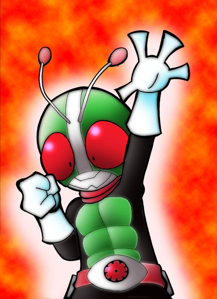Takeshi Hongo (本郷 猛 Hongō Takeshi) is Kamen Rider 1 (仮面ライダー1号 Kamen Raidā Ichigō), or Kamen Rider 1-go, the original Kamen Rider. He first appeared in Kamen Rider, the first installment in the long-running Kamen Rider franchise of tokusatsu programs. The primary protagonist of the series, Kamen Rider 1 is a motorcycle-riding superhero modeled after a Grasshopper. One of the most recognizable and iconic characters in Japanese entertainment, Kamen Rider 1 is as irrecoverably burnt into the cultural subconscious as the series itself.Takeshi is a young man who was kidnapped by the secret organization Shocker and forced to undergo a procedure that turns him into a super-powered cyborg. Before he can be brainwashed into doing Shocker's bidding, he escapes and becomes the first Kamen Rider, fighting for humanity's freedom against the evil forces that created him. Each episode sees Takeshi meeting another of Shocker's soldiers, interacting with supporting characters (such as his mentor, Tobei Tachibana), and ultimately defeating the enemy, often with trademark "Rider Kick" or "Rider Punch" attacks.