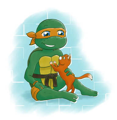 He also seems to have a strong affinity for animals, ranging from a stray kitten that wandered into the lair to exotic pets like a parrot he named Ditto. Unlike the other Turtles, he has had multiple pets or animal companions, which he typically became very emotionally attached to, to the point of chasing his pet fish Max into a sewer full of migrating fish. He had a particularly strong bond with Pete, the pigeon that he nursed to health after finding him with a broken wing.