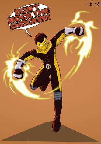Shocker was hired by a mobster to take out a subway train wagon full of jurors. After a brief battle with Spider-Man, he was knocked unconscious while Spider-Man used his gauntlets to destroy rubble blocking the path. Although he seemed cooperative at first, as soon as he was secured by Spider-Man, he activated a powerful shock in his gauntlets through his belt, causing the main exit to collapse and allowing him to escape. On their way to collect money from bets on superhero fights, Shocker and Boomerang discovered the dead body of "The Bookie."