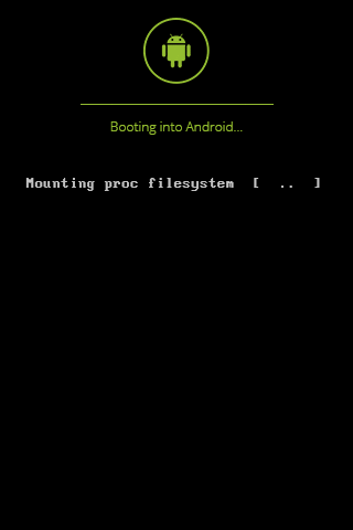 Fonts: Initially Terminal, after "Loading formatting rules...": Terminus. I'm sorry for antialiasing after font change, but Terminus results too tiny when not using antialiasing. Open Sans below Android logo.