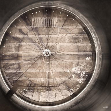 I like the sharp contrast of the tires curves against the solid lines of the brik wall.