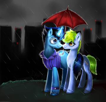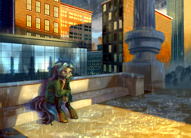 There's few times I have the chance to draw two of my best friends together in the same drawing. I had a lot of fun figuring out the perspective and coming up with the rain effects and all the neat colouring areas. In the beginning I was going to draw this one in muted colours and leave the ponies fully coloured, but in the end I changed my mind and went for a more colourful approach. I think this was the way to go.
