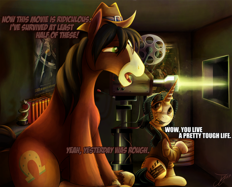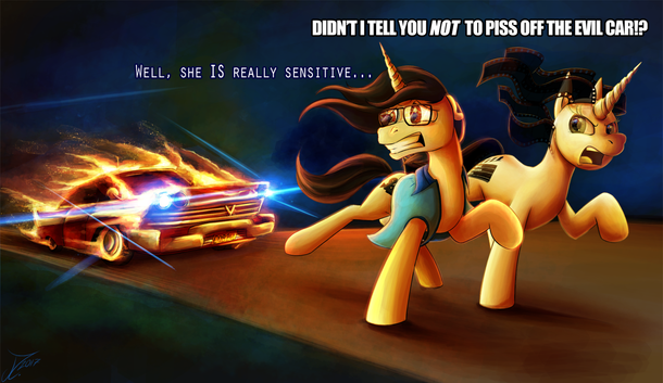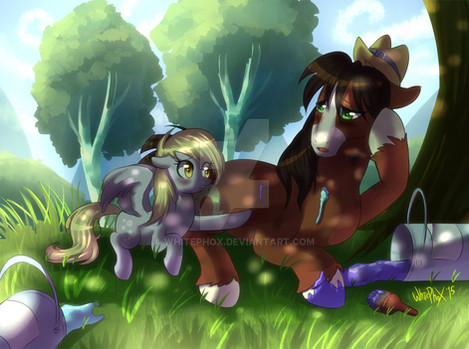 Commission for featuring his OC and 's pony.Based on a true story.