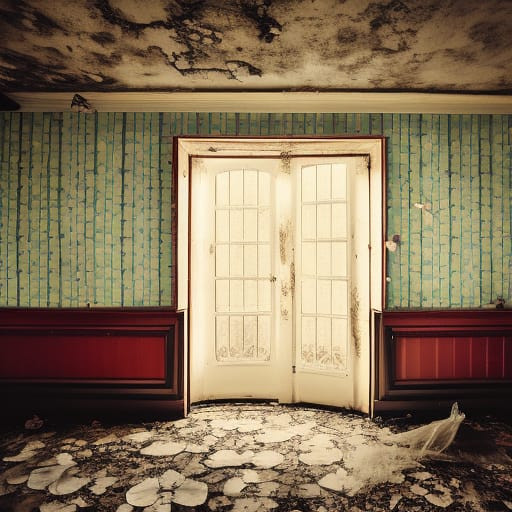 A scene from a vacant historical Ontario farmhouse seen from the ensuite looking through to the bathroom in one of the spacious bedrooms within the home.Abandoned Farmhouse, Ontario, Canada