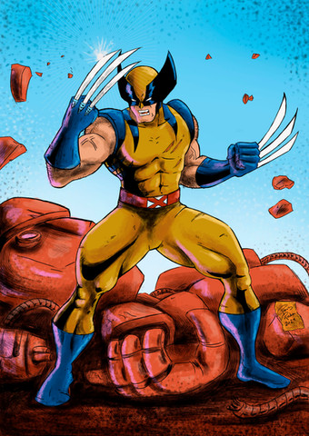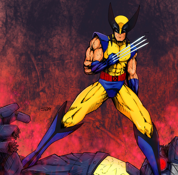 "Wolverine OUT OF FUCKING NOWHERE!" "Blam" <=== This is what I was thinking the whole time I was drawing this. LOL. Wolverine here is cutting up that Sentinal like a tin can. As we all know, he's the best at what he does.Tried something completely new, more painterly. Pissed me off that I couldn't seem to really use the shading work that I did in the black and white pre-drawing. I always get screwed trying to go from the mentality of the Daily Sketch Challenge (which I usually do in black and white) and then trying to go to color. Almost everything here had to be redrawn because when I tried to add color, it was so muted as to be useless (ie. using the black and white shaded drawing over top of the color layer, using a multiply layer, doesn't work